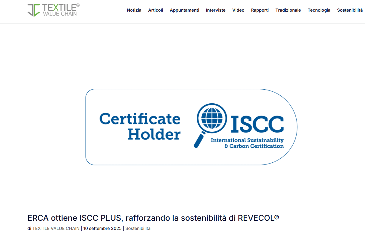 ERCA SpA, a leading company in chemical solutions innovation and exclusive manufacturer of REVECOL®, is proud to announce the successful completion of ISCC PLUS (International Sustainability and Carbon Certification) certification. This milestone reinforces ERCA’s commitment to promoting the bioeconomy, the circular economy, and certified innovation for the textile chemical sector…