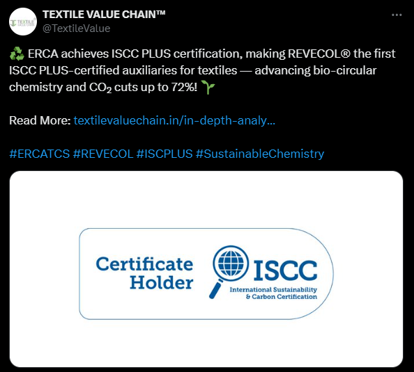 ERCA achieves ISCC PLUS certification, making REVECOL® the first ISCC PLUS-certified auxiliaries for textiles — advancing bio-circular chemistry and CO₂ cuts up to 72%…