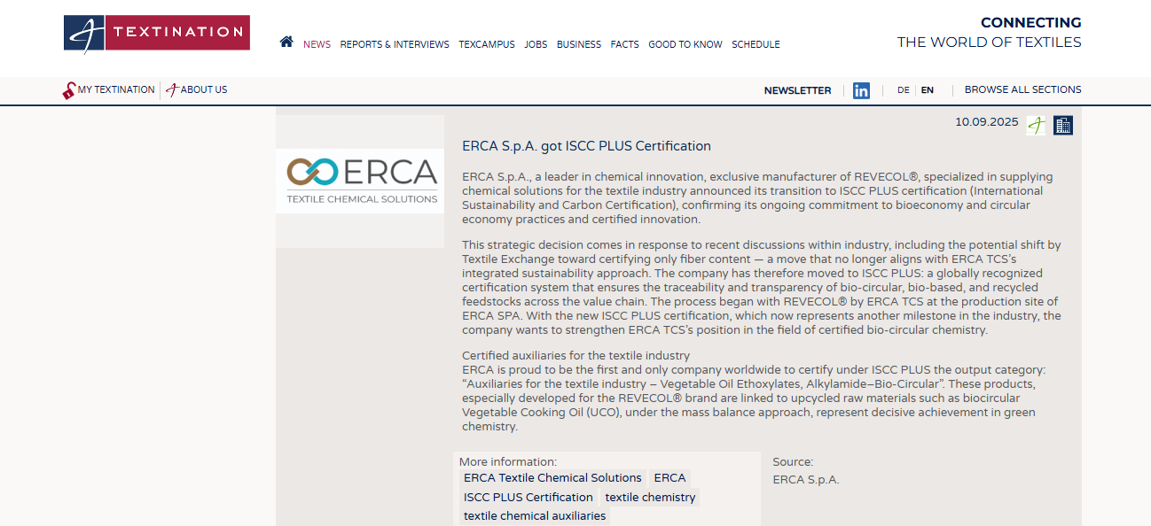 ERCA S.p.A., a leader in chemical innovation, exclusive manufacturer of REVECOL®, specialized in supplying chemical solutions for the textile industry announced its transition to ISCC PLUS certification (International Sustainability and Carbon Certification), confirming its ongoing commitment to bioeconomy and circular economy practices and certified innovation…